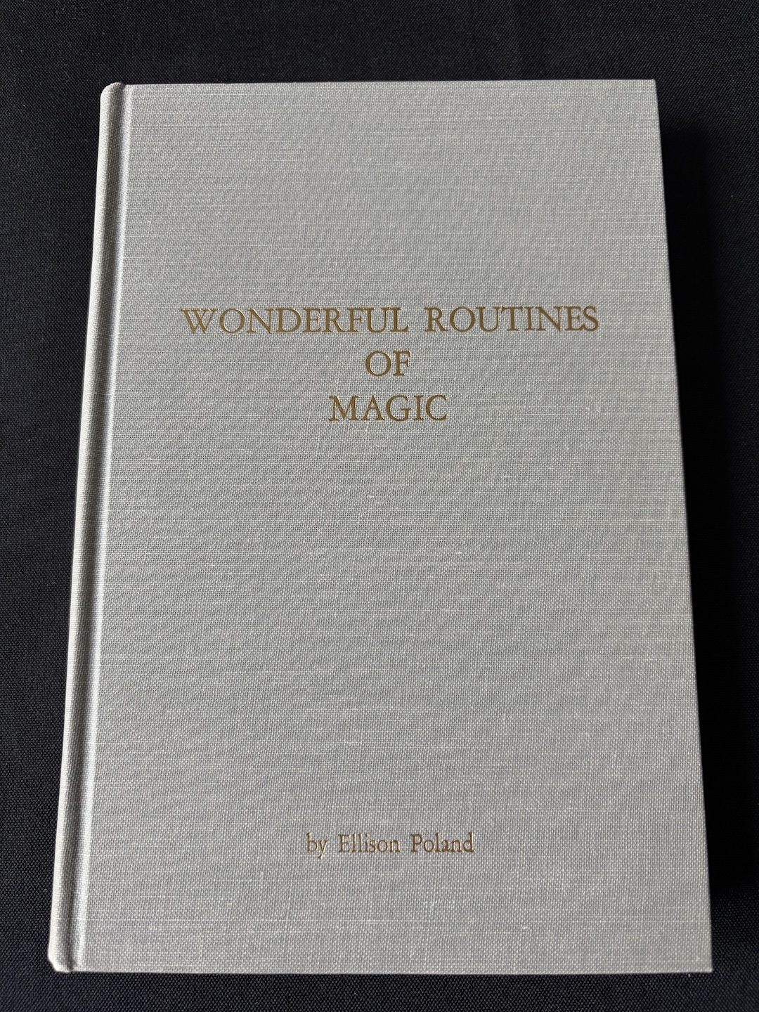 Wonderful Routines of Magic is an overlooked gem in magic publications. The late Ellison Poland published the first edition in 1969. A number of contributors, including the author, offer a wide variety of magic effects for stage and close-up. There are seven effects offered by North Carolina's own Bill Spooner including the Deceptive Roll Cut. Milliken's Transposition is worth the price of the book. It is a double transportation with two halves and two quarters. Ellison Poland was a technical writer for Westinghouse and knew the art of writing magic instructions. He was also a great illustrator. The 251- page book is well illustrated with numerous line drawings. There is also a section on Decorating and Finishing Magical Apparatus. The table of contents has 55 entries. Wonderful Routines Of Magic concludes with an annotated bibliography.