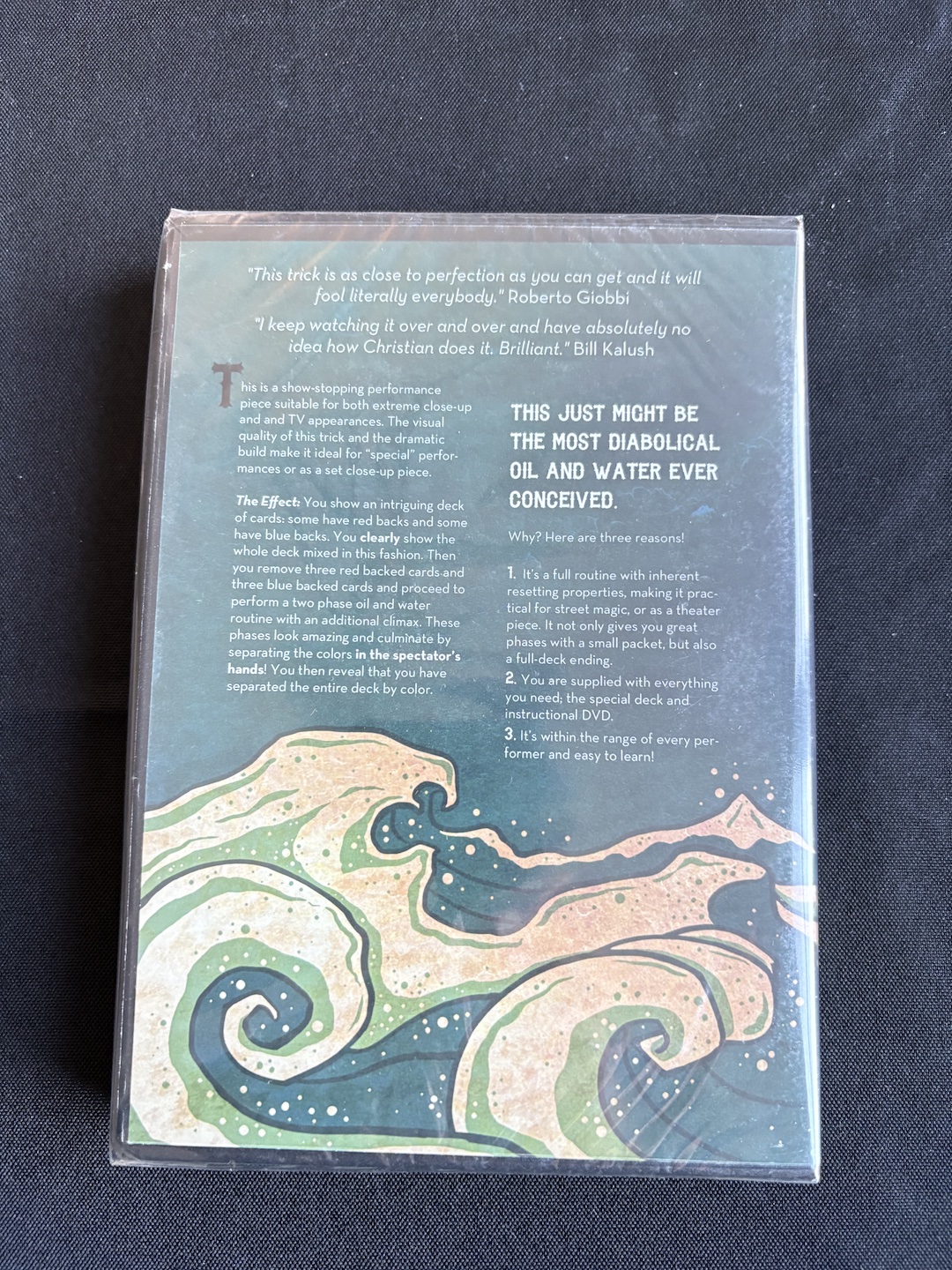 You show an intriguing deck of cards: some have red backs and some have blue backs. You clearly show the whole deck mixed in this fashion. Then you remove three red-backed cards and three blue-backed cards and proceed to perform a two-phase oil-and-water routine with an additional climax. These phases look amazing and culminate by separating the colors in the spectator's hands! You then reveal that you have separated the entire deck by color.