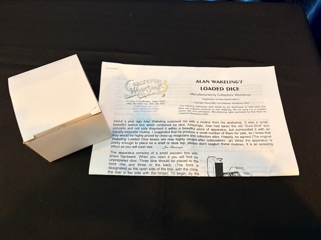 Conceived by legendary magician Alan Wakeling and praised by Jim Steinmeyer himself, Loaded Dice is a brilliant reimagining of the classic “sure-shot dice box”—refined into a stunning, handcrafted walnut prop and elevated by a deeply deceptive multi-phase routine.